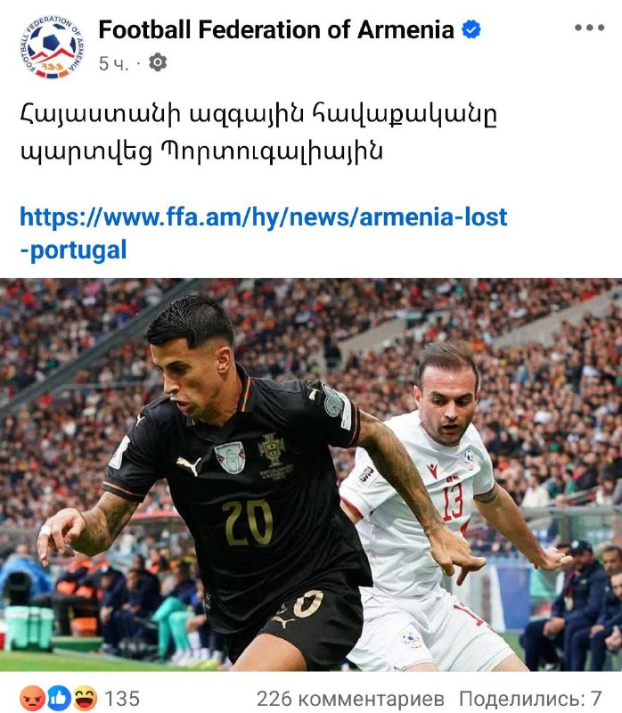 ❗️Тем времени футбольная федерация Армении скромно сообщила, что армянская сборная просто проиграла португальцам 🤦‍♂