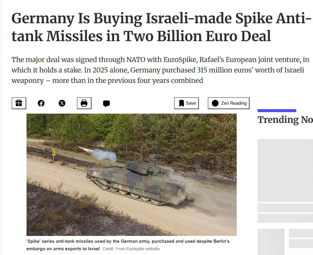 Помимо Spike, Германия в 2025 году заключила контракты с израильскими компаниями на 315 млн евро, включая поставки дронов Heron (IAI), оборудования для A400M и артсистем Puls от Elbit Systems.