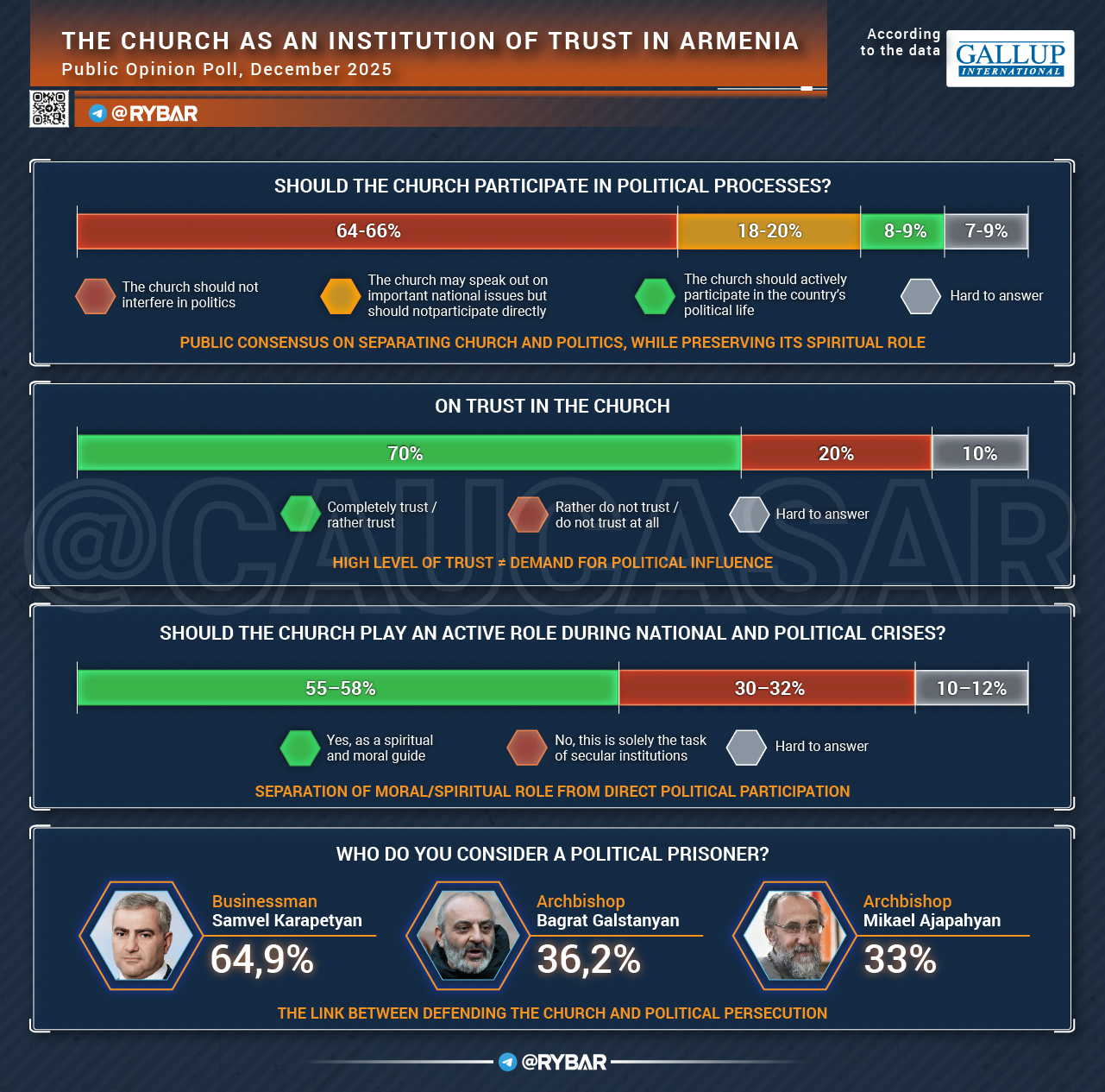 ➡️Опрошенные считают, что в Армении есть политзаключенные и самые популярные из них как раз расплачиваются за защиту церкви — бизнесмен Самвел Карапетян, архиепископы Баграт Галстанян и Микаел Аджапахян.